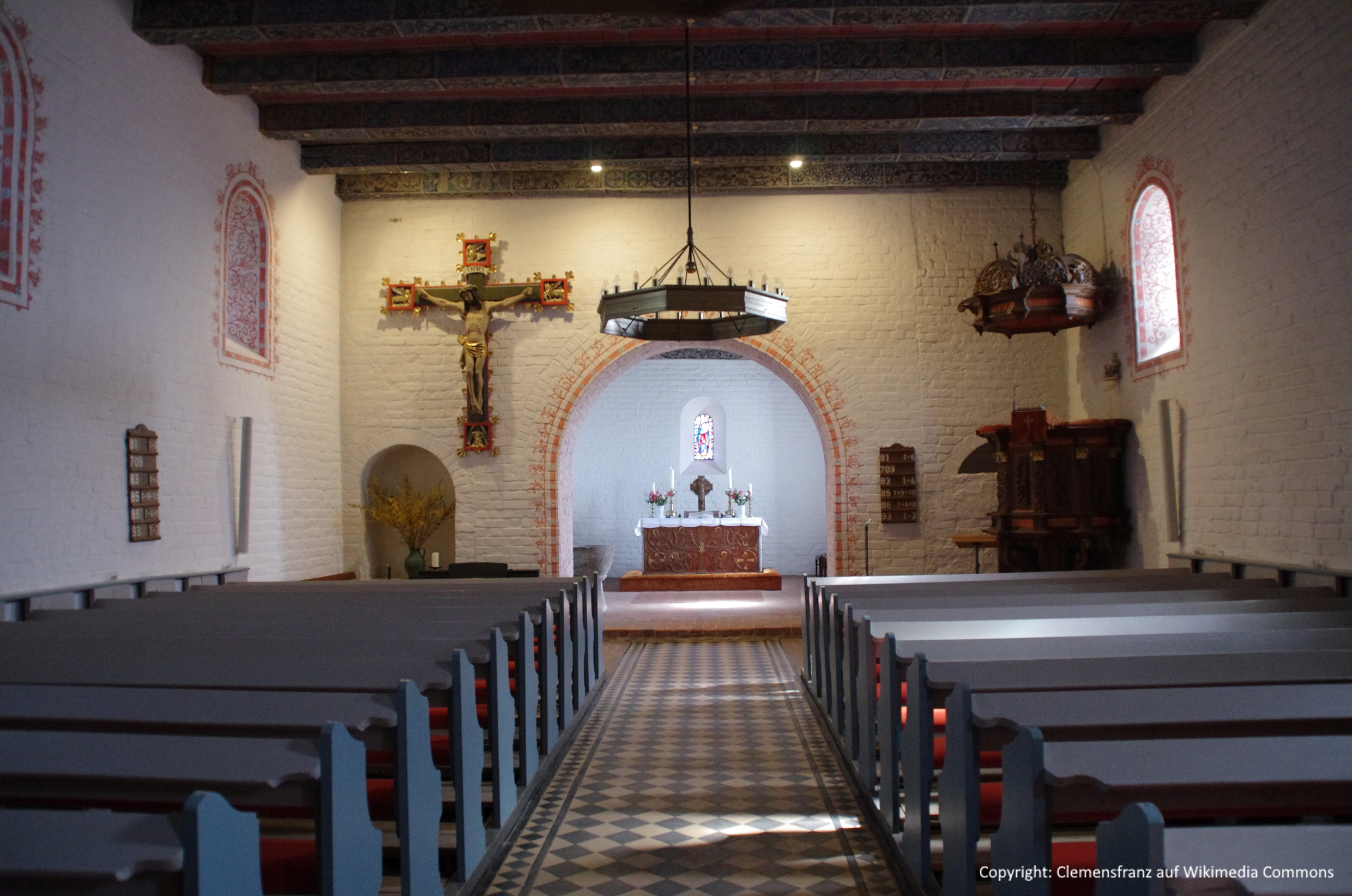Der Innenraum der Kirche wirkt heute bewusst schlicht und relativ dunkel. Die freigelegte Balkendecke ist mit ornamentalen Malereien versehen. Fenster und Chorbogen werden von Rankenornamenten eingerahmt, und alle Fenster sind mit farbiger Bleiverglasung ausgestattet. Das Ostfenster zeigt Maria mit dem Kind auf der Mondsichel, während in den Seitenfenstern elf Apostel dargestellt sind.