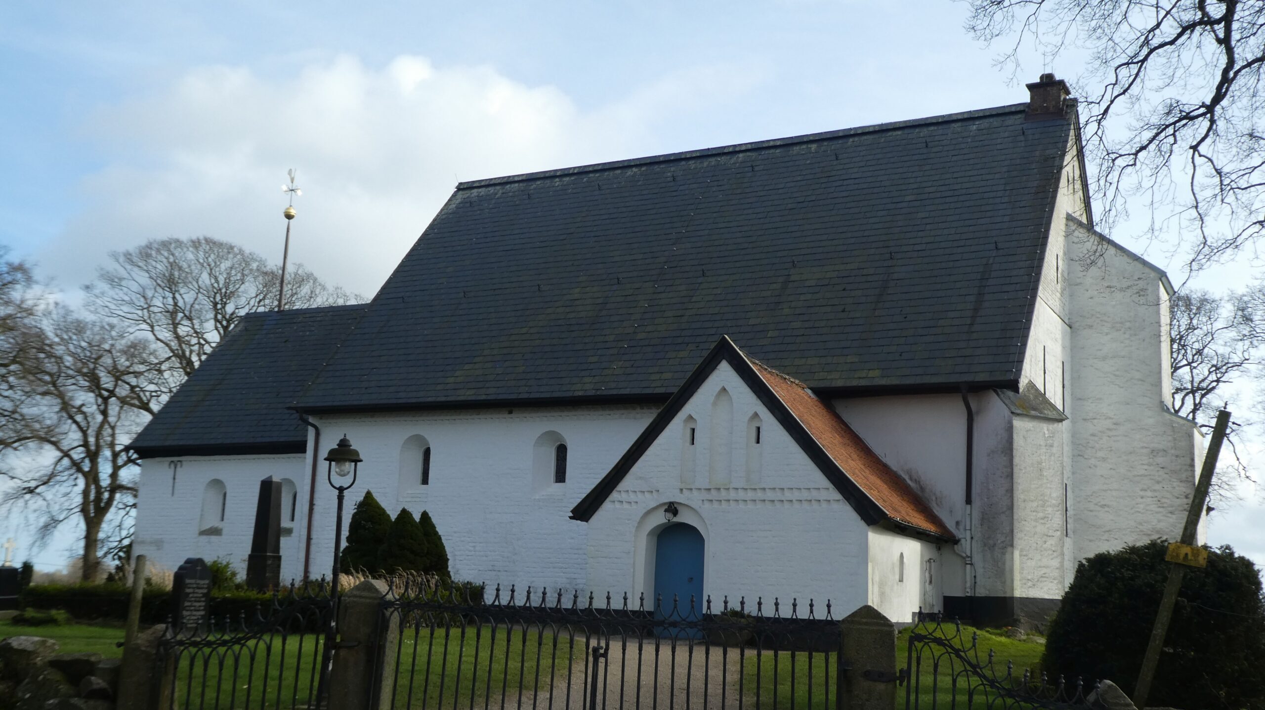 Die Kirche liegt leicht erhöht am Rand des Dorfes und wird von einem Friedhof umgeben. Ein weiter Vorplatz verbindet die Dorfstraße mit dem Kirchgelände. Dieser Platz wird von historischen Gebäuden eingerahmt, darunter das ehemalige Küsterhaus – ein Fachwerkbau aus der Zeit um 1800, der ursprünglich als erste Dorfschule diente und heute als Gemeindehaus genutzt wird. Nordöstlich der Kirche steht ein hölzerner Glockenturm aus dem Jahr 1693, der noch die traditionelle Bauform der Angelner Glockenstapel bewahrt.